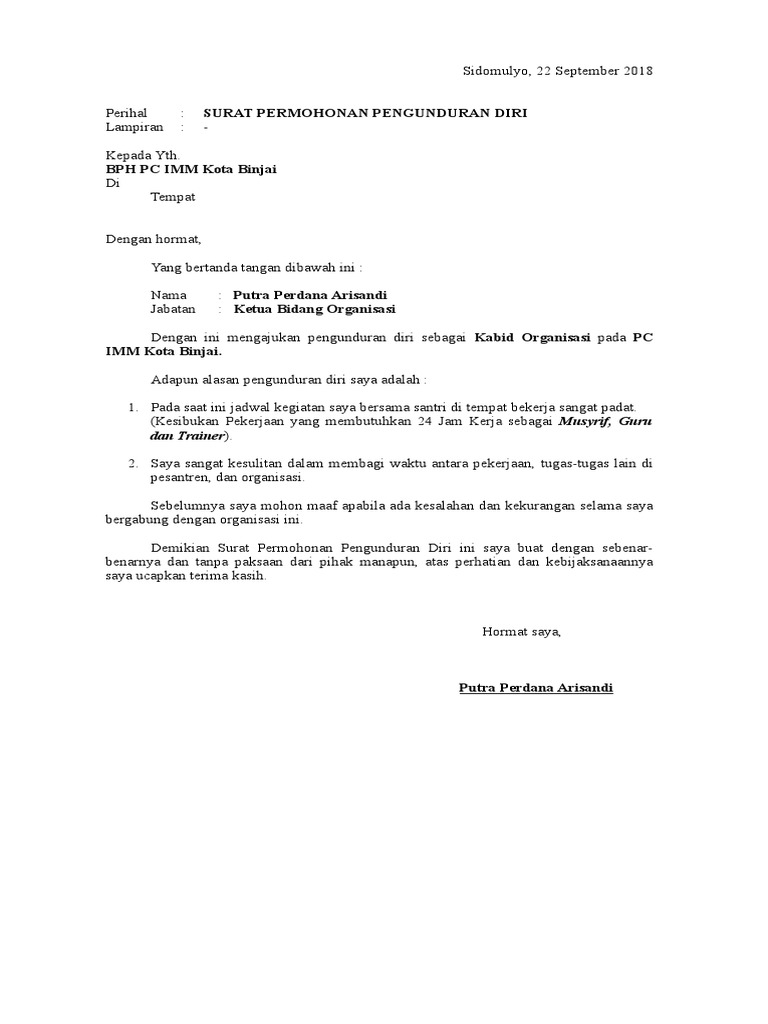 Pengunduran diri yang dimaksud adalah berhubungan dengan jabatan atau. Seperti pada contoh surat pengunduran diri diatas, anda dapat melihat bahwasanya alasan dari ia memutuskan untuk berhenti dari organisasi tersebut memanglah pantas. Adapun alasan dari pengunduran diri ini. Demikian surat permohonan pengunduran diri dari saya sebagai ketua oramas cabang purwokerto timur. Bagi kamu yang ingin mengundurkan diri dari sebuah posisi di institusi perusahaan atau lembaga organisasi, langkah yang umum dilakukan adalah mengajukan sebuah surat pengunduran diri.